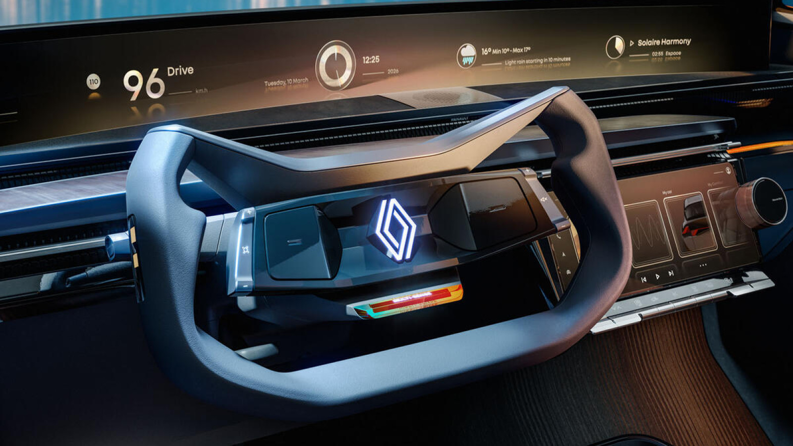 Renault has included a curved, panoramic screen that covers the width of the dashboard. Renault says the system can control several key functions, which can be “controlled as naturally as a smartphone”. There is also a small yoke steering wheel and a steer-by-wire system.