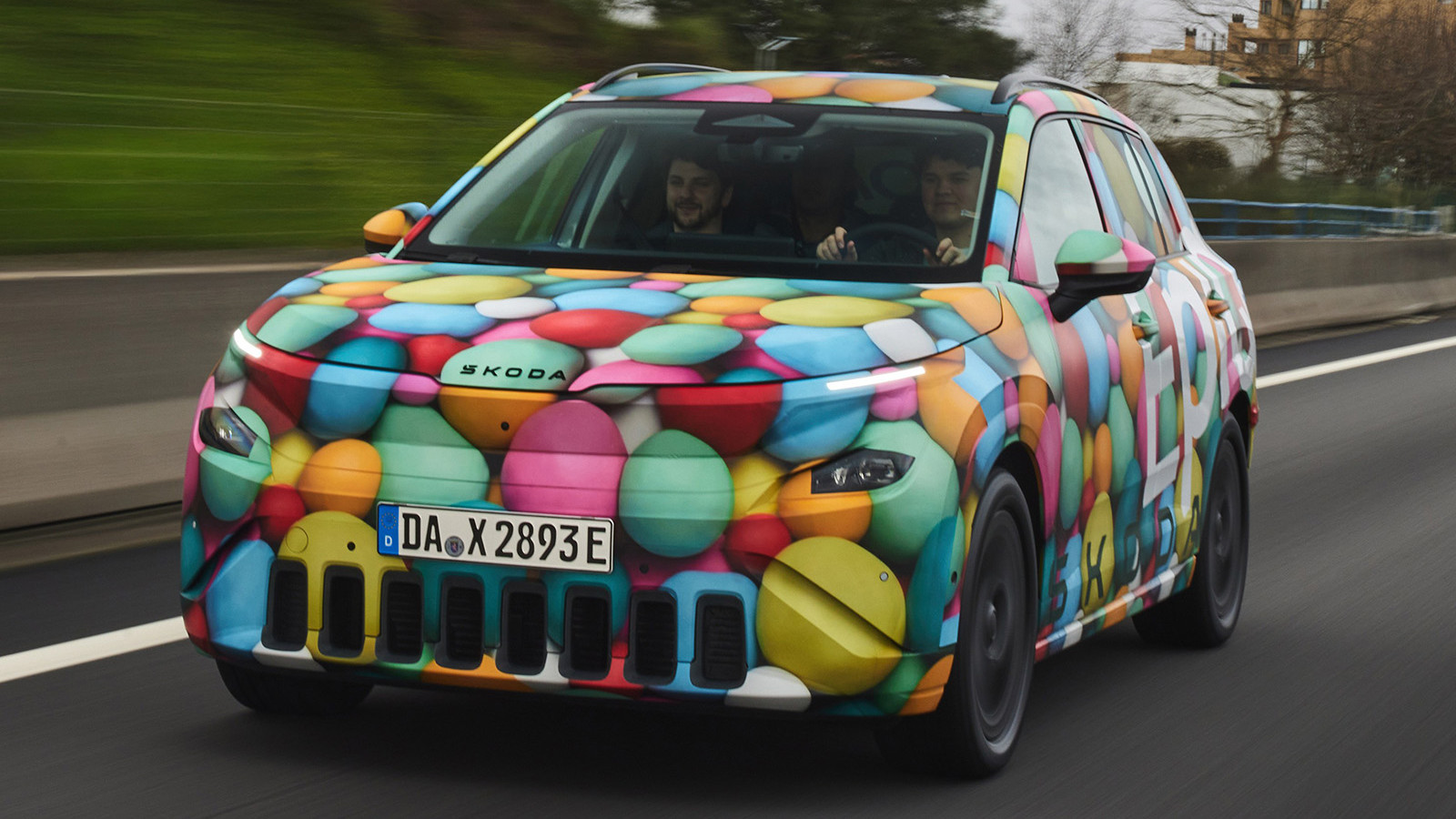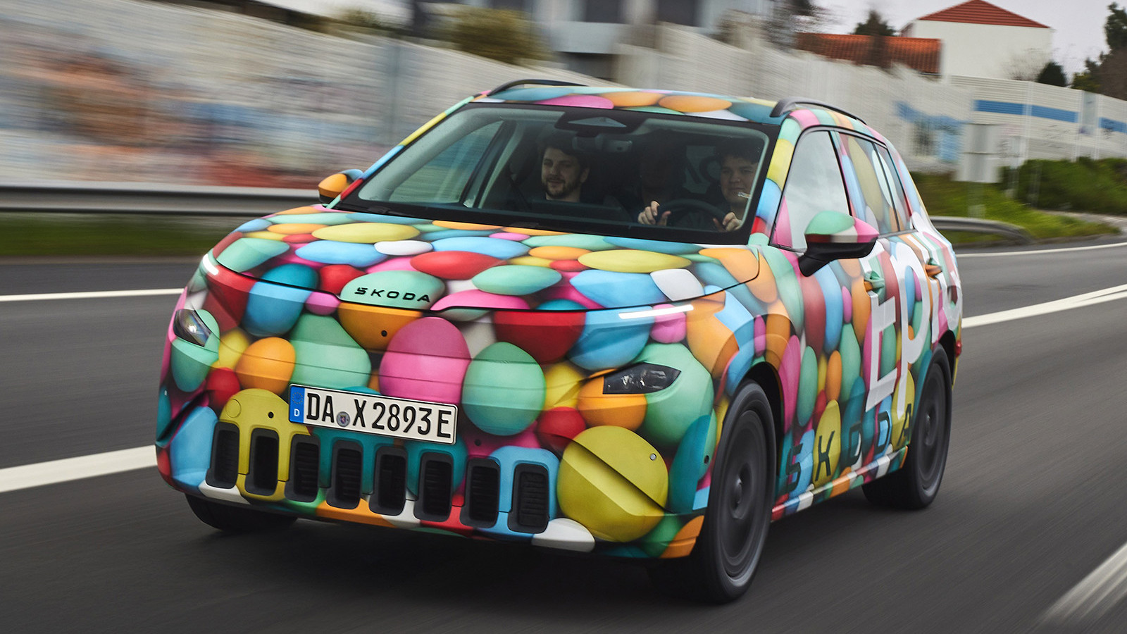 Wie schon der Elroq und der Enyaq vor ihm greift er das neue Modern Solid-Designkonzept von Skoda auf – auch wenn ich unter der bunten Tarnung meines Vorserien-Testwagens davon nichts erkennen konnte.