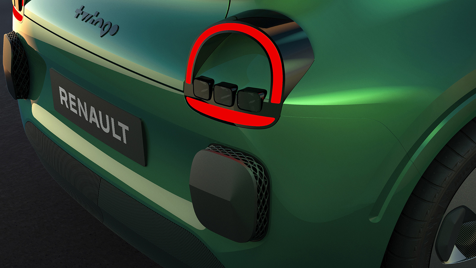 Ein subtileres nostalgisches Designmerkmal ist der auffällige rote Warnblinkerknopf des Prototyps, eine Anspielung auf den ähnlich auffälligen, kuppelförmigen Knopf oben auf dem Armaturenbrett des alten Twingo. Eine weitere urbane Reminiszenz an die 1990er Jahre ist die Verstellung der Vordersitzlehnen mit Hilfe von Skateboard-Rädern.