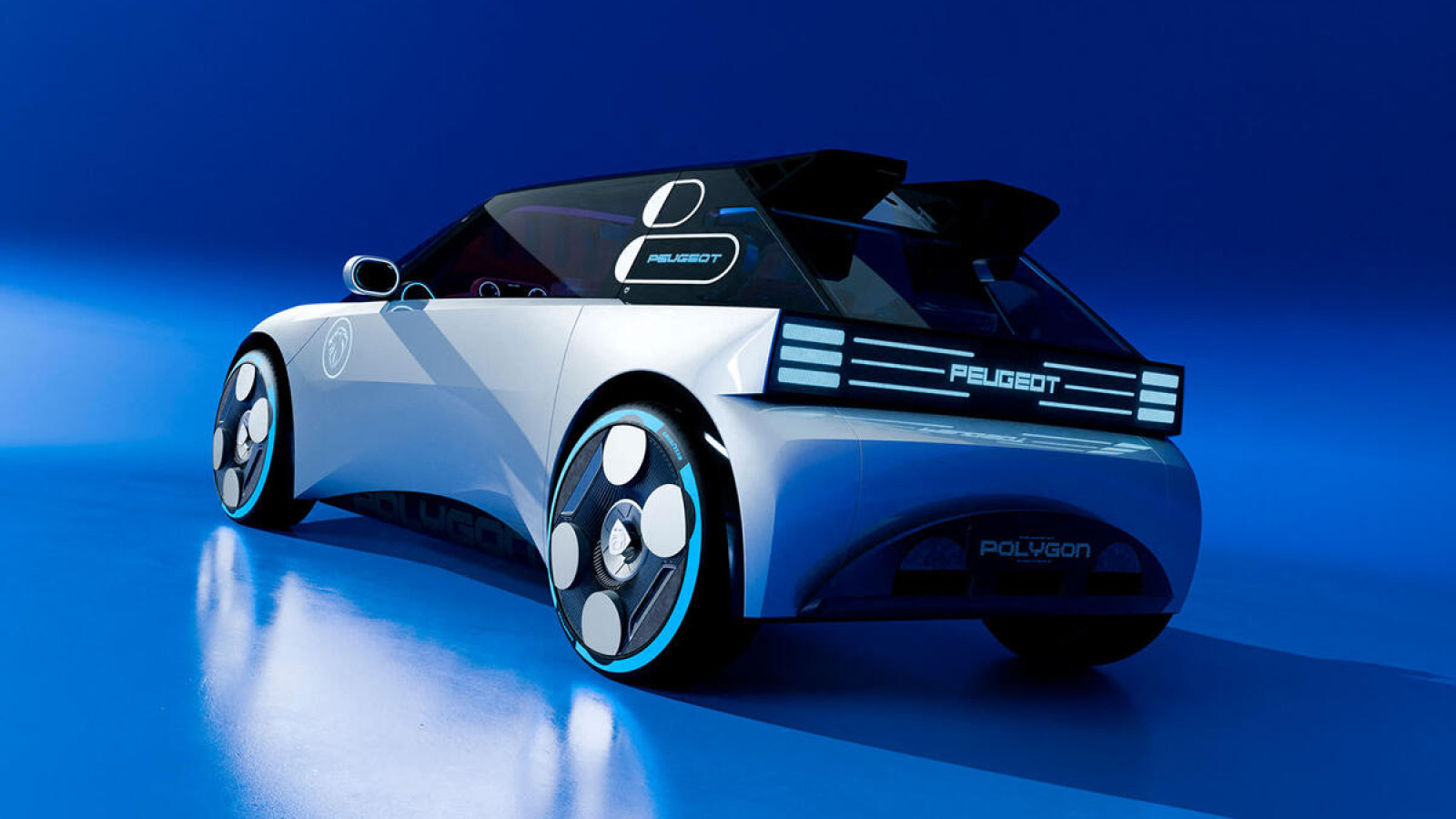 Die C-Säule ist eine Hommage an den 205 GTi; die rautenförmigen Embleme des Originalmodells wurden als LED-Leuchten neu interpretiert, um den Ladezustand der Batterie des Polygon anzuzeigen.