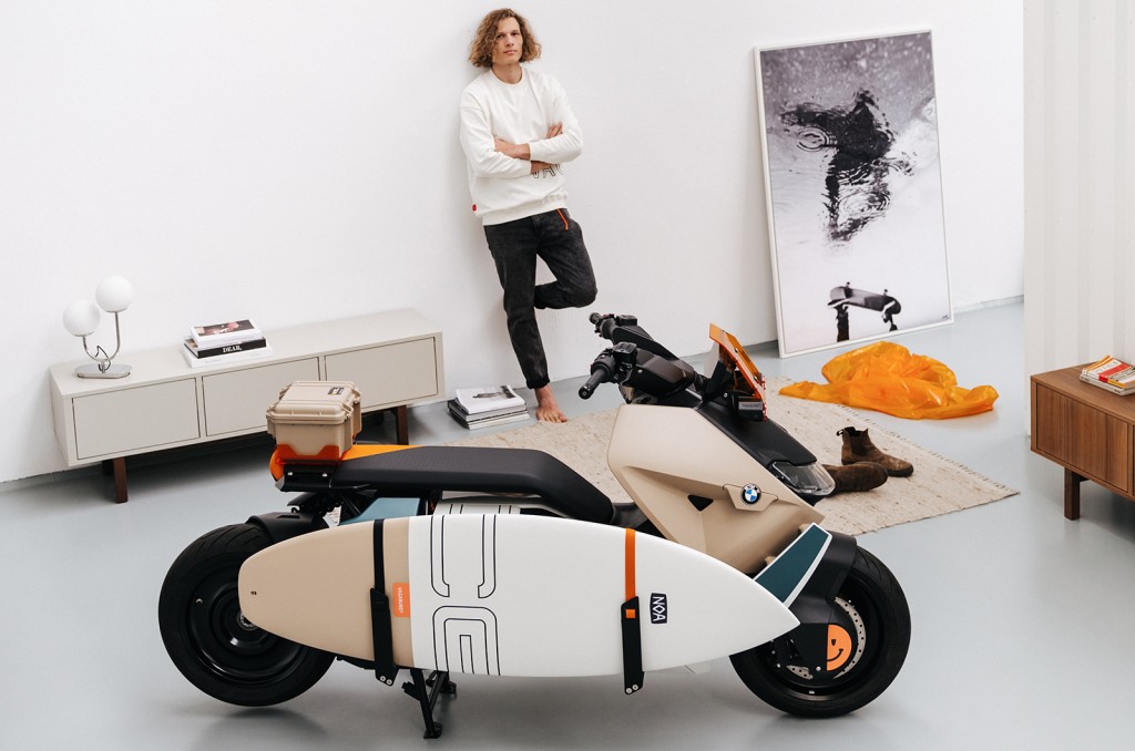 The machine is a collaboration between BMW Motorrad Austria and Austrian motorbike customisation specialist Vagabund, and is a BMW CE 04 that has been heavily customised to showcase new multifunctional design elements. Including, most notably, a special attachment giving it ability to carry a surfboard.