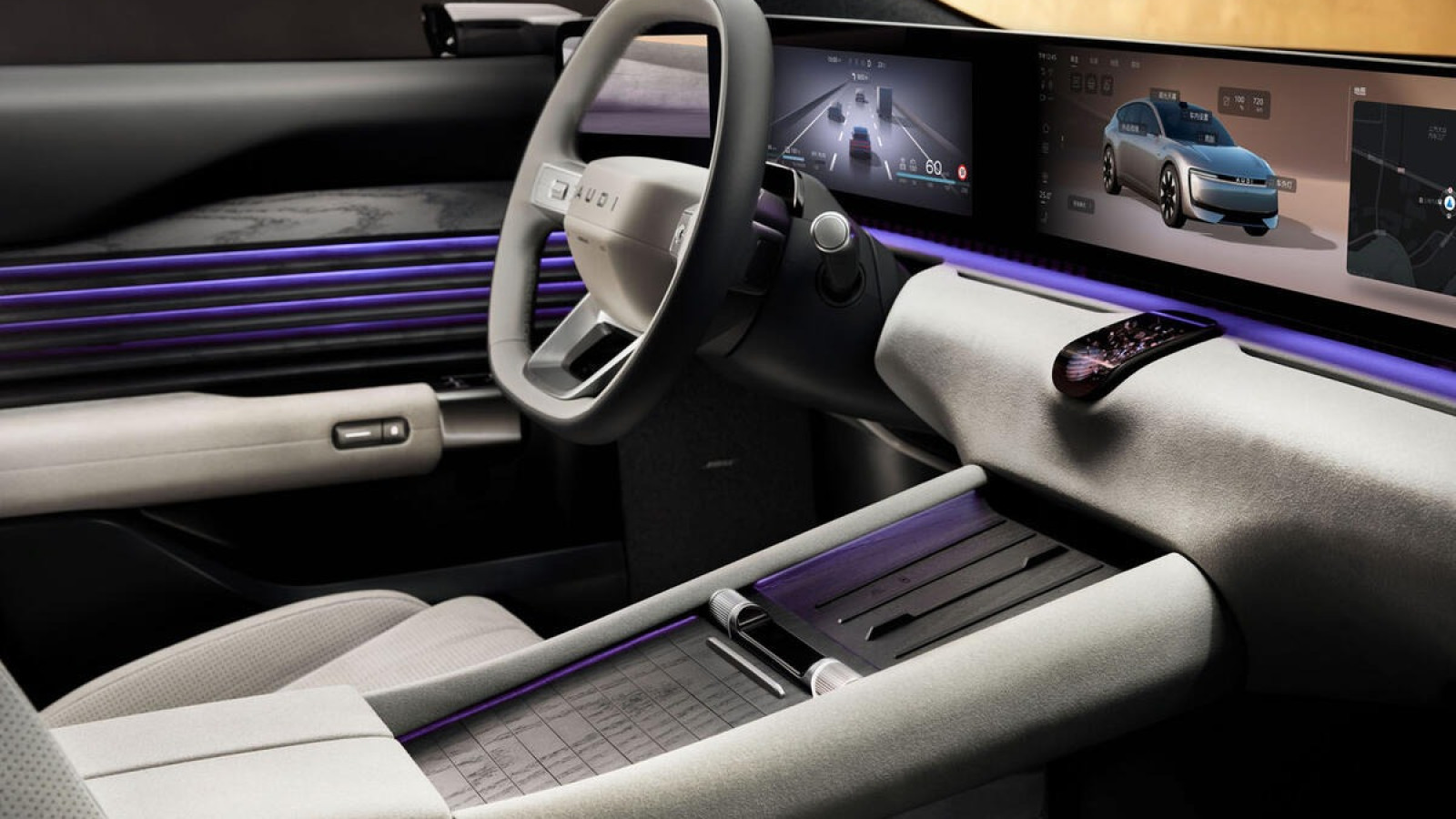 La voiture met également l'accent sur les capacités de conduite autonome, offrant la possibilité de prendre le contrôle à la fois sur autoroute et en ville. La combinaison d'un boîtier lidar monté sur le toit, de trois radars à longue portée, de 12 capteurs à ultrasons et d'un ensemble de caméras lui permet de "prévoir les tricycles et les livreurs comme un vétéran des hutongs de Pékin", affirme Audi.