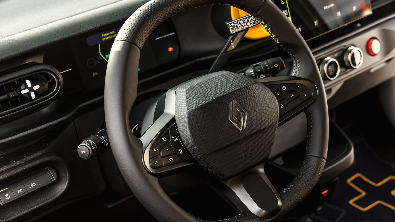 De instrumenten zijn gedurfd en eenvoudig, terwijl de ventilatieopeningen, de knoppen op het stuur en de reeks schakelaars in het midden allemaal echt zijn.