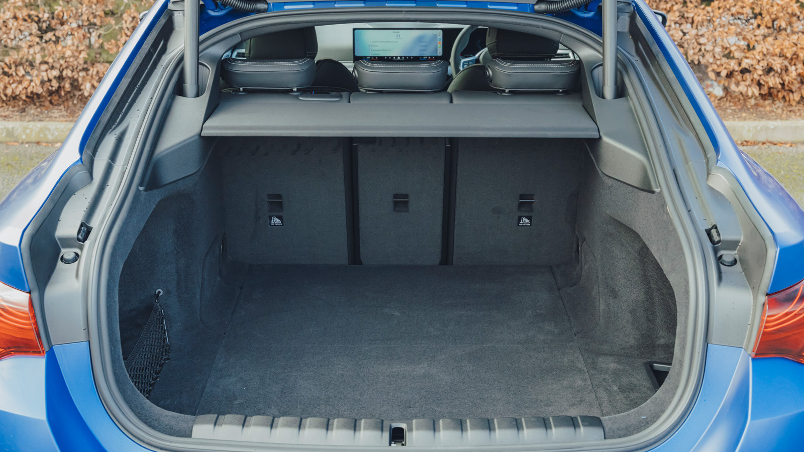 Även om utrymmet för passagerarna i baksätet är något begränsat – mer lämpligt för barn än vuxna – är BMW i4 faktiskt något trängre än 2024 Porsche Taycan som vi tidigare mätt. I4 har dock överlägsen lastpraktik tack vare sin liftback-design. Bagageluckan öppnas till ett användbart utrymme på 470 liter, betydligt mer än konkurrenter som Audi S E-tron GT (350 liter).